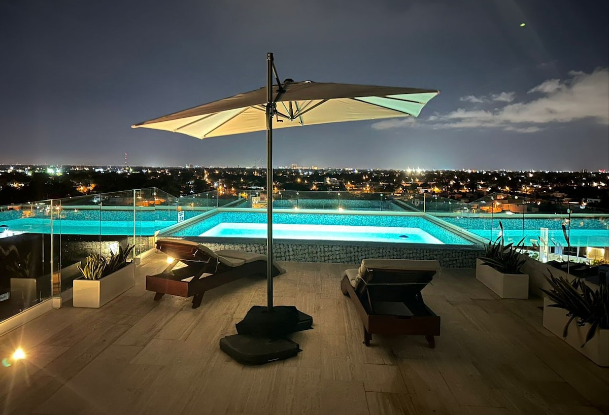 Vacker renoverad vindsvåning perfekt för par, vi strävar efter att hålla den oklanderlig och med alla möjliga tjänster. Beläget 2 kvarter från Prolongación Paseo Montejo, i Colonia Buenavista. 300 mb/sekund WIFI Njut av en bekväm dubbelsäng och en 55-tums Smart TV.
