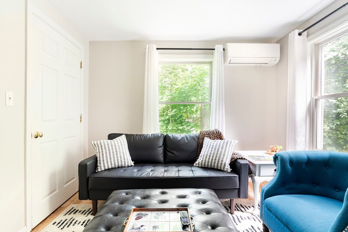 Nyrenoverad, modern, professionellt rengjord stuga mellan Portland och Freeport. Fläckfri interiör med fullt utrustat kök, Netflix/AppleTV+, premium Tuft+Needle-säng, tvättmaskin/torktumlare och laddning av elfordon. Gå ner Main Street till butiker, restauranger och den natursköna Royal River. Enkla resor till downhill skidåkning och ikoniska stränder, Portlands berömda restauranger, LL Bean flaggskepp och topprankade bryggerier. Din perfekta bas för alla äventyr i Maine.