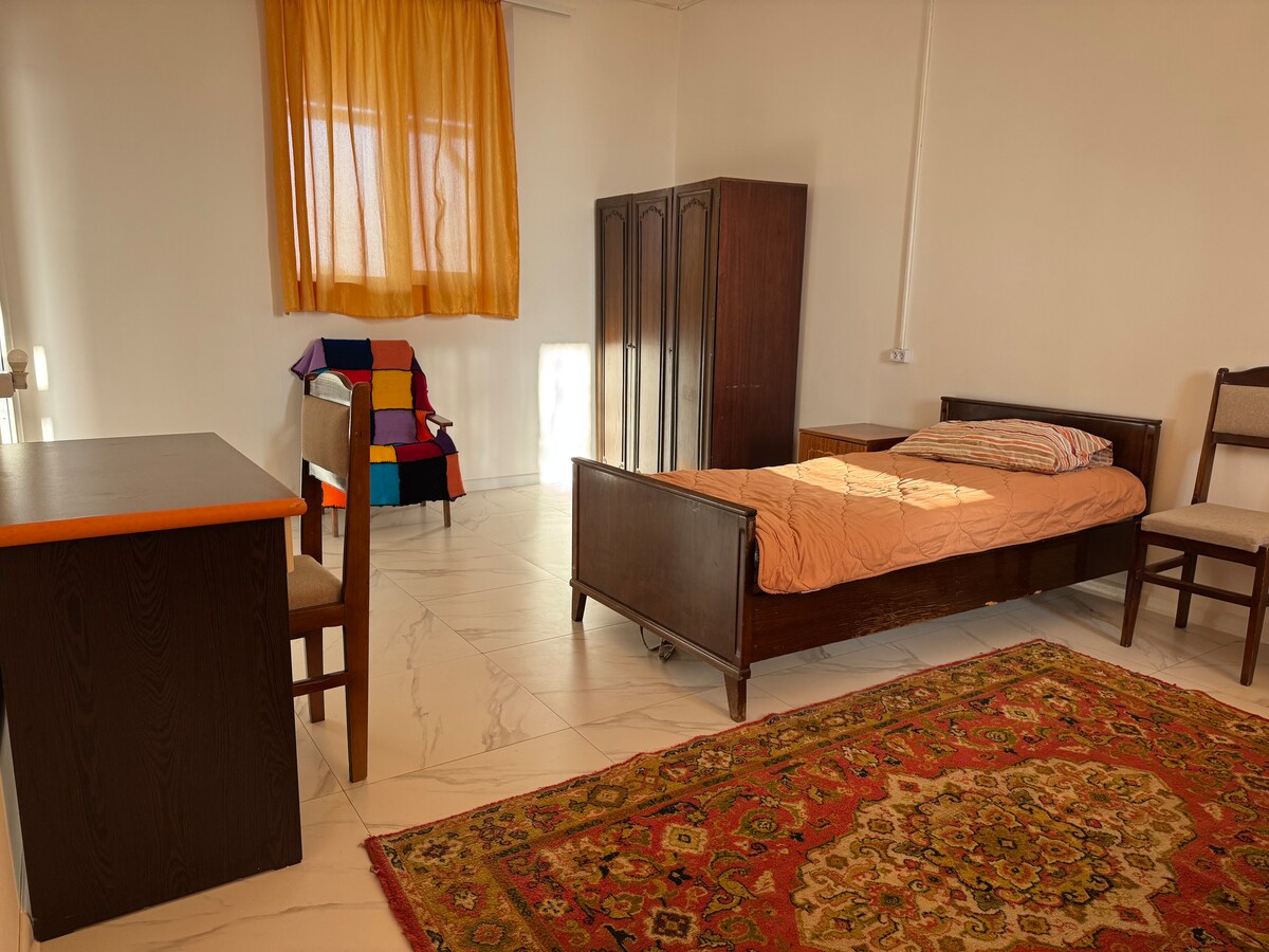 En stuga nära Yerevan Reservoir. Andra våningen i huset, inte ansluten till första våningen, ingången är endast separat från gården. En stor veranda. Möbler är nytt, badrum med nya VVS, luftkonditionering. Det finns inga nya apparater på fotot - kyl, mikrovågsugn, spis, tvättmaskin. Du kan slappna av i lusthuset vid sjön. Det finns vingårdar och aprikosträd runtomkring. finns även en grill som ni också får använda. Nära huset finns en minibusshållplats som går till centrum, med taxi till centrum på 10 minuter.