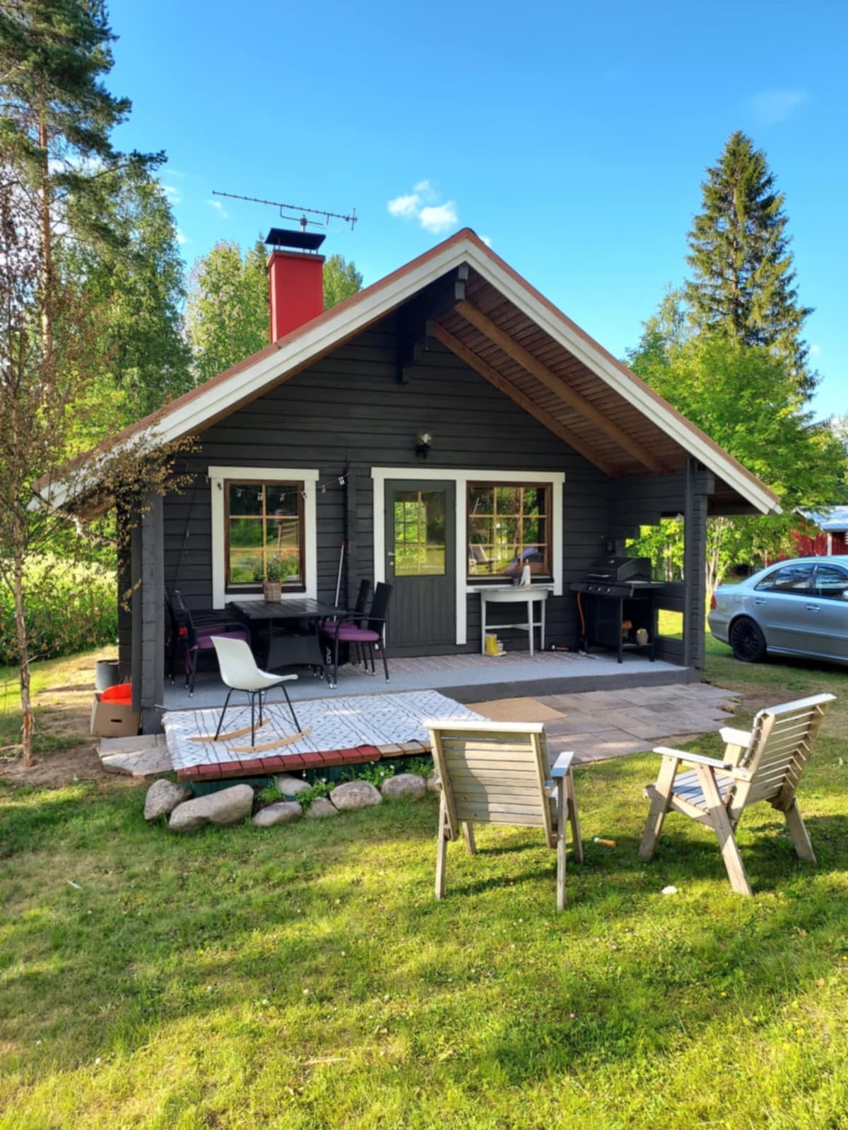 Traditionell finsk sommarstuga med bastubyggnad, separat sovstuga, utomhustoalett och grillbaldakin. Boendet ligger längs Matkusjoki-floden. Högre upp på gården ligger den gamla Jokela-skolan (rv. 1928), som vi renoverade. Om du gillar autentiska sommarstugor med minimal extra komfort kan detta vara din sommarresmål. Vi njöt särskilt av den milda ångan från den vedeldade bastun och det uppfriskande dopp i flodens avkopplande lugn. Varmt välkomna till vårt sommarställe!