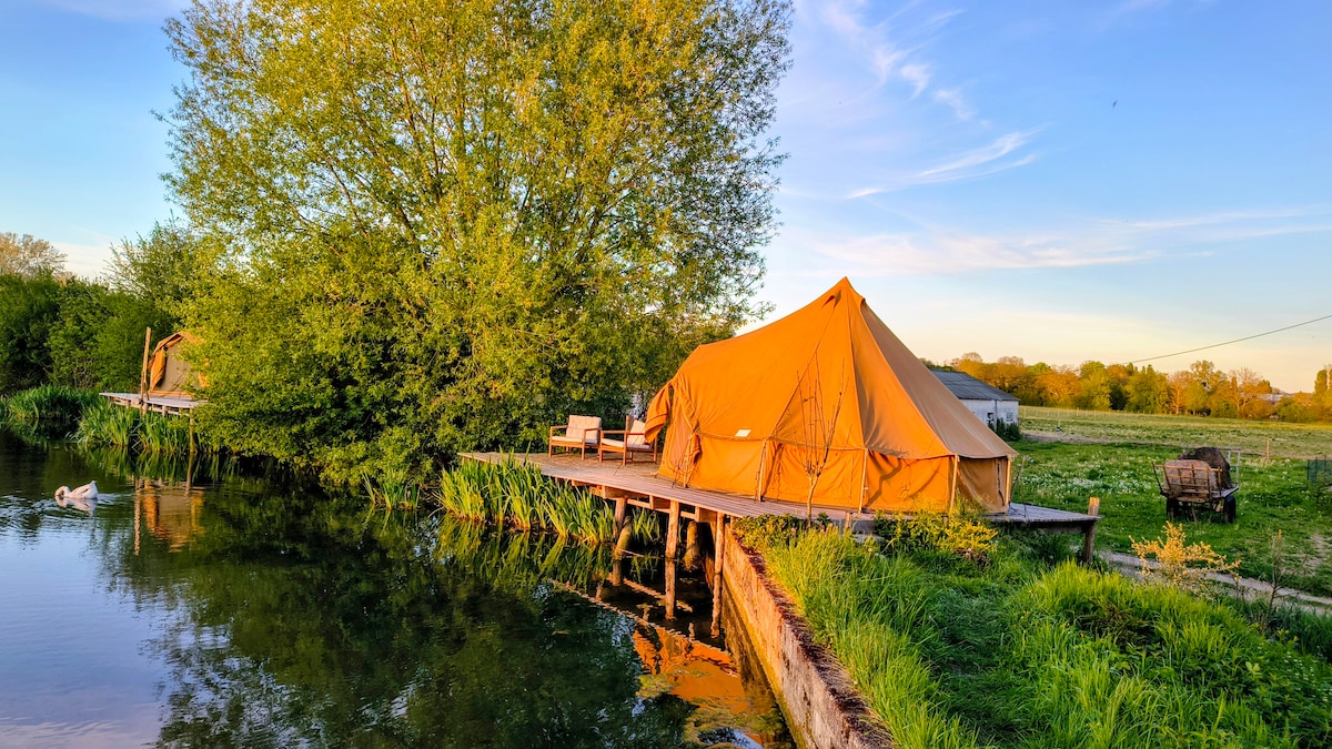 Bo i den charmiga och ovanliga miljön i detta romantiska boende mitt i naturen. Våra tält är placerade vid kanten av vattenmagasinet i en gård som föder upp hästar, getter, får, grisar och fjäderfä. Du kommer därför att höra ljudet av vattnet och djuren. Du kommer att ha tillgång till ett badrum med dusch i kvarnbyggnaden. Tältet är inrett med komfort, har elektrisk uppvärmning. Du kan beställa måltider med gårdens produkter.