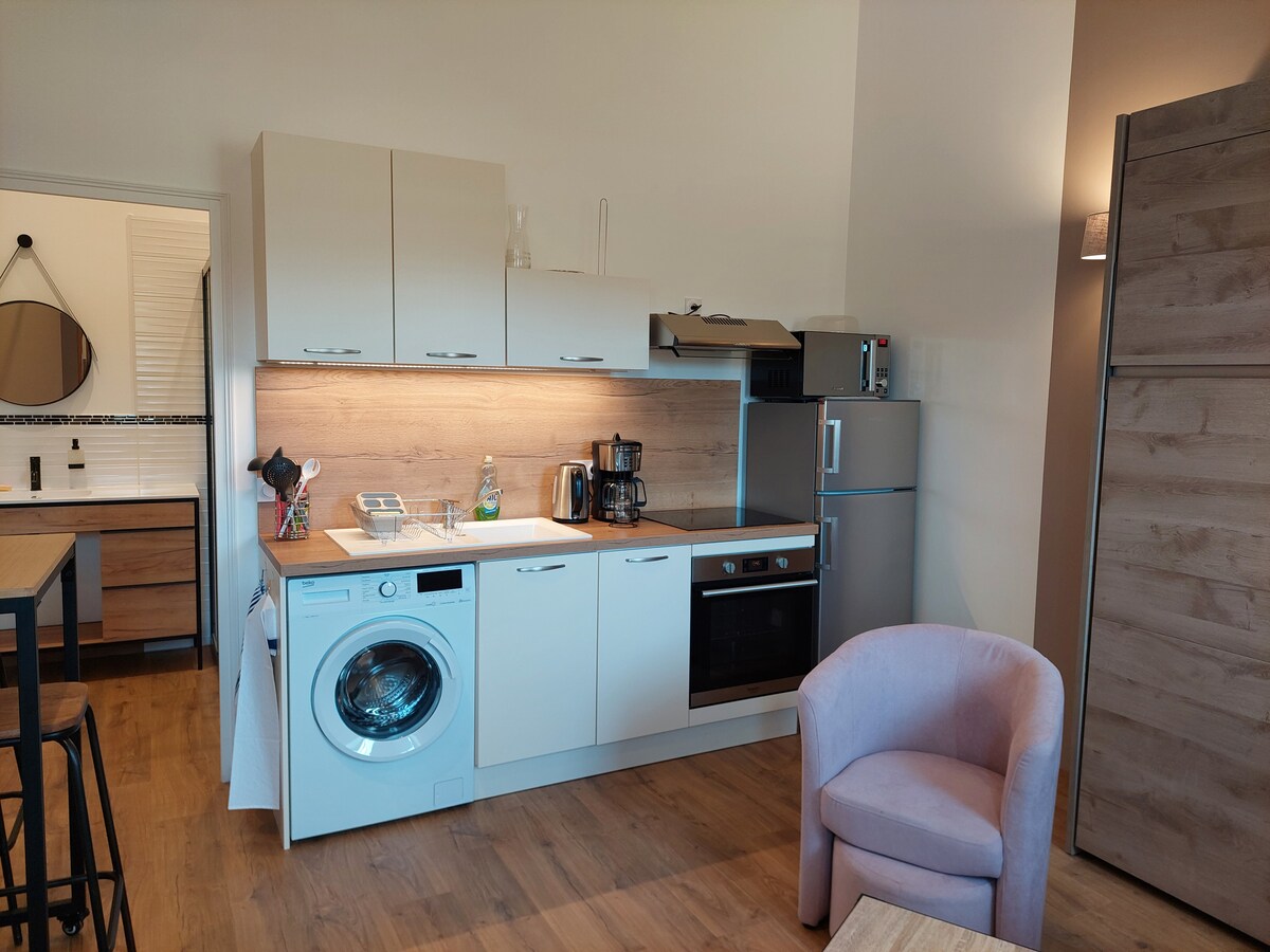 Hej renoverat studiolägenhet Inkluderar ett badrum utrustat med toalett, handfat, spegel, kolonn, handduk och klädhängare, badmatta. Utrustat kök med mikrovågsugn, kylskåp, kaffebryggare, spis, redskap... Vardagsrum utrustat med förvaringsskåp, garderob med garderob och spegel, matbord med stolar, 1 bäddsoffa, täcke och kudde, platt skärm. Grill Täckt terrass och trädbevuxen park Under din vistelse kommer vi att vara granne Inga husdjur tillåtna 🚬inomhus