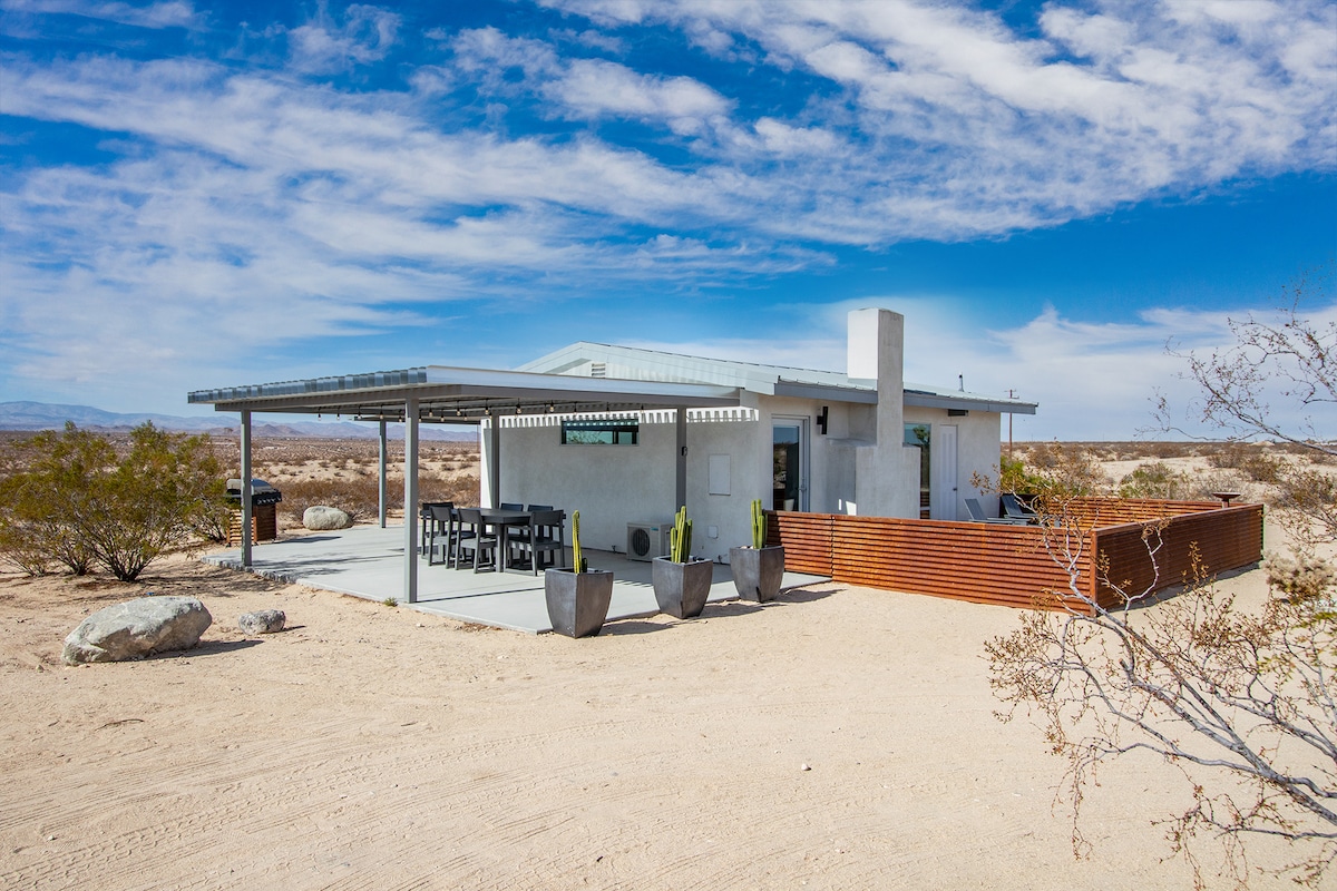 Oavsett om du är sugen på fridfull ensamhet eller oförglömliga ökenäventyr är detta eleganta gömställe den perfekta basen. Vår moderna tillflyktsort är perfekt för par eller små grupper och erbjuder en lyxig men jordnära upplevelse – utformad för att hjälpa dig att verkligen koppla av. Vad du kommer att älska: • Nybyggt modernt hem + panoramautsikt över öknen • Privat bubbelpool + Stjärnskådningsdäck för drömlika ökenkvällar • Över 4 000 kvadratmeter mark för att återförenas med naturen • Bara några minuter till Joshua Tree National Park + Yucca Valley butiker