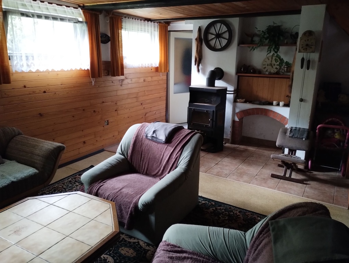 En stuga med en vacker utsikt över vattennivån i Moravian Karst. Den består av ett rum (37 m2), ett hörn med badkar och toalett. Det finns ett fullt utrustat kök. Värmen hanteras av en öppen spis och en infrapan. Det finns en dubbelsäng, en enkelsäng och en bäddsoffa för två. Trädgården är stor 777 m2, har bara en granne och är helt inhägnad. Det finns en kanot för två att låna. Detta boende är för den som vill vara utomhus och förstå vad det innebär. Kära gäster, vänligen leta inte efter lyxen i era lägenheter hos oss.