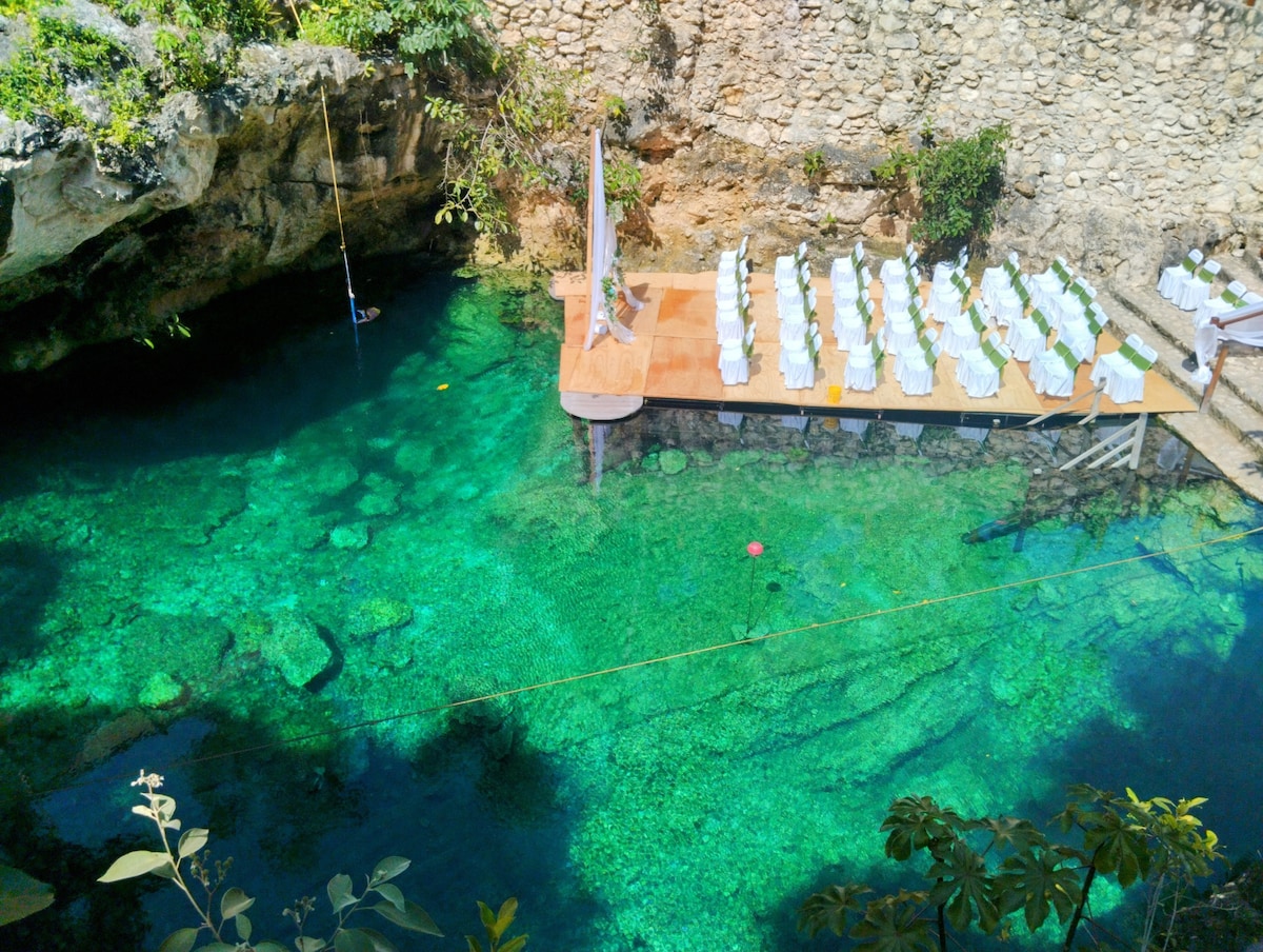 - Naturlig miljö för avkoppling - Privat altan med tillgång till en naturlig cenote-pool - Inbäddat i djungeln i La Veleta, ett av de trevligaste områdena i Tulum - 10 minuter från stranden med bil. - Det är en kort promenad till ett café och 15 minuter till Holistika Wellness Center eller Calle 7 Sur restauranger och barer. - Vi erbjuder Kundalini-klasser på begäran - Frukost ingår - 10 % rabatt i 2 Ceibas Beach Club - Cyklar - Massage på plats för ett bekvämt pris - Tvättservice – Städningstjänst