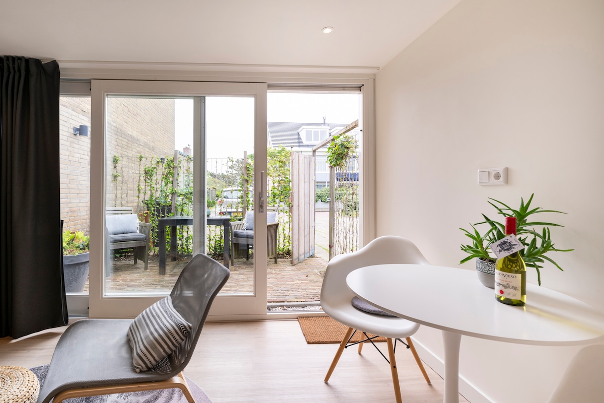 En härlig lugn lägenhet, nära stranden, stationen och centrum. Från terrassen kan du se havet! Två minuters promenad och du är på stranden. Lägenheten har en egen ingång. Inomhus finns allt; kök, dusch, toalett, sängkläder, handdukar, kaffe, te, schampo. Mittemot huset finns ett privat garage för din bil. Stationen ligger tre minuters promenad bort. Med tåg är det en kort resa till Haarlem och Amsterdam. Kort sagt; perfekt för en härlig kort eller lång semester!