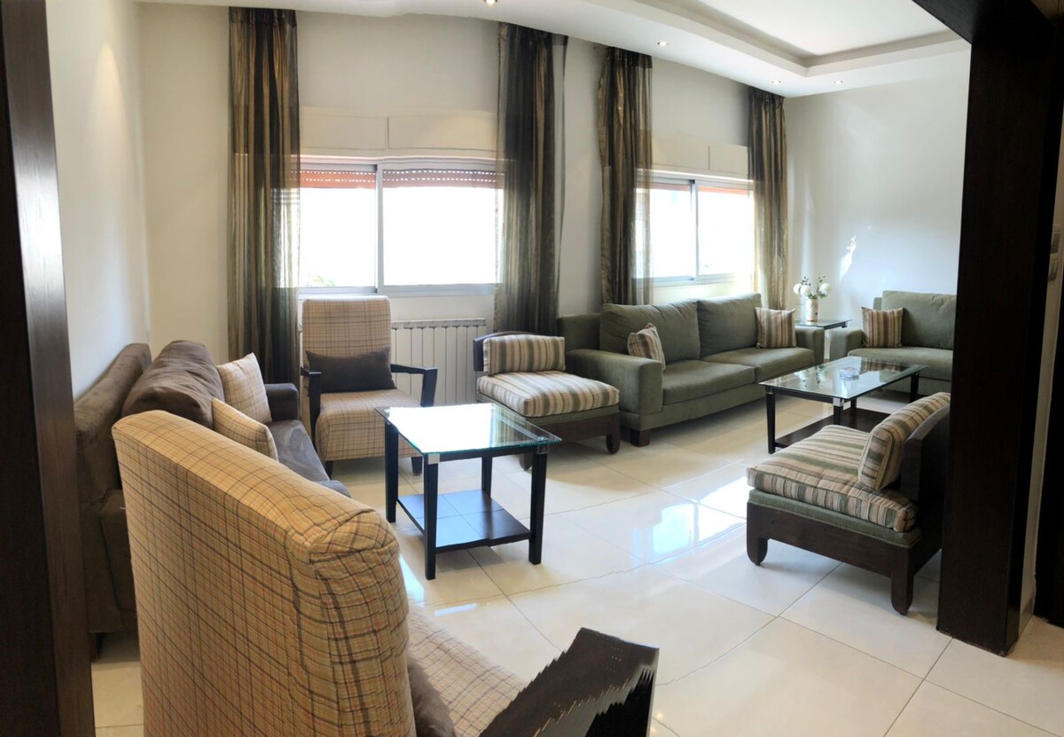 Modern lyx i hjärtat av Amman. Denna rymliga lägenhet med 3 sovrum och 2,5 badrum rymmer upp till 8 gäster med eleganta marmorgolv, LED-belysning och ett elegant öppet vardagsrum. Höjdpunkter inkluderar ett anpassat tyskt kök med premium apparater, tvättmaskin/torktumlare i enheten och en privat balkong med sittplatser för fem och en gunga. Med luftkonditionering i varje rum och höghastighets-WiFi är det den perfekta vistelsen för familjer, affärsresenärer eller grupper som söker komfort och stil.