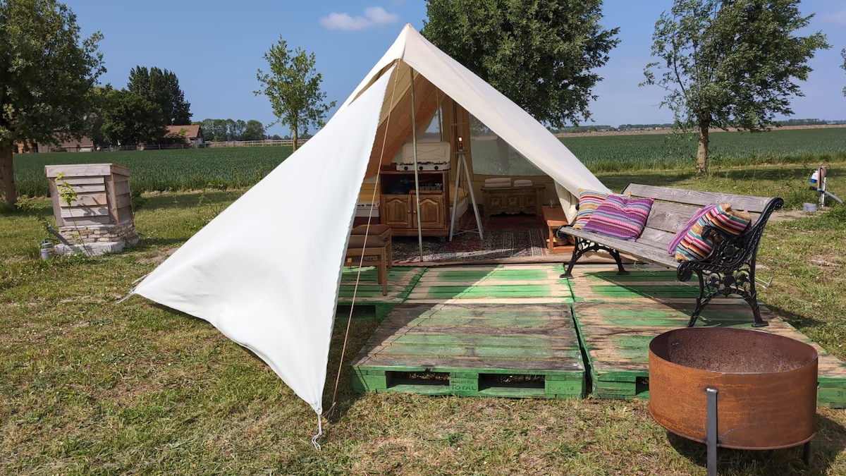 På vår vackra 1600-tals gård Slapershaven, mitt i poldern nära staden Oostburg, bor du i ett mysigt safaritält med el. Den mysiga safarin har ett litet pentry med 3-brännare gasspis, porslin, vatten jerry can och en 24-liters elektrisk kylare; alltid en kall dryck inom räckhåll! En 2-personers nybäddad säng och handdukar väntar på dig vid ankomst. Vi har också 2 unikt inredda bohemiska klocktält med el.