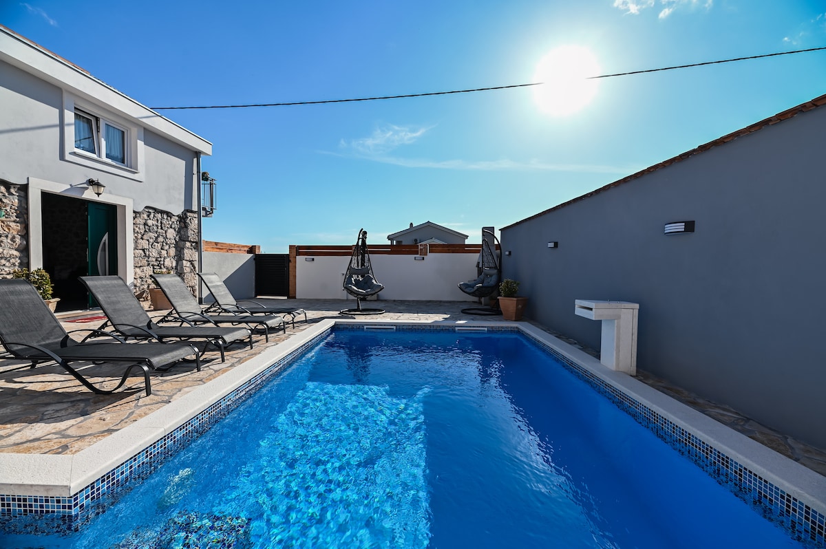 Autentiskt medelhavs stenhus med stor uppvärmd pool (30 m2 med jacuzzi bänk) i by nära Zadar. Total yta på marken är 300 m2 med privat parkering, trädgård, stor uppvärmd pool, 6 solstolar i trä och två stora terrasser med lounge. För nöjes skull finns biljard, bordtennis, fotbollsmål, picado. Huset ligger i en liten by borta från stadens buller. Den har en vacker öppen utsikt över naturen och mauntines. Du kan njuta av fullständig avskildhet. Huset är souranden av fält och du kan se husdjur
