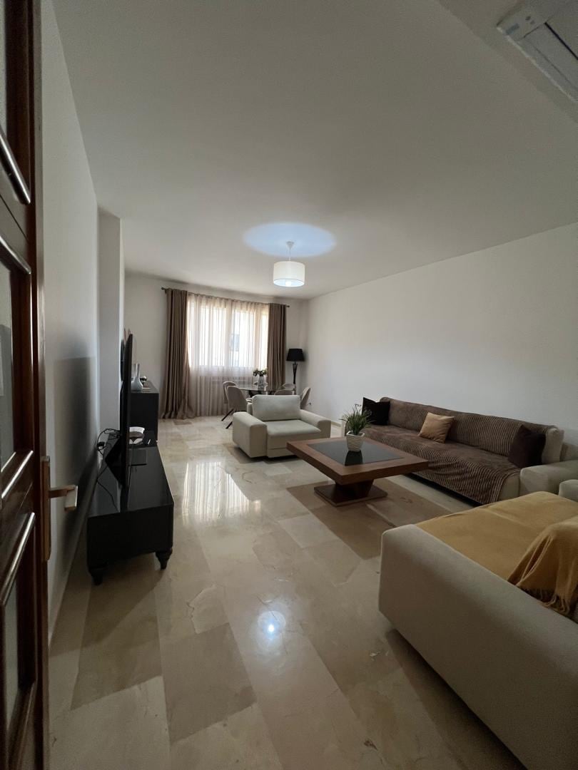 Denna vackra F3-lägenhet har ett utmärkt läge nära Garden City och välkomnar dig till ett inhägnat boende som heter ”Les Palmiers” i Ouled Fayet. Här finns 2 sovrum, ett rymligt vardagsrum, ett utrustat kök och ett badrum på tredje våningen i en lugn och säker byggnad. Boendet är fullt möblerat och har även säker parkering Samt alla bekvämligheter vid foten av byggnaden.