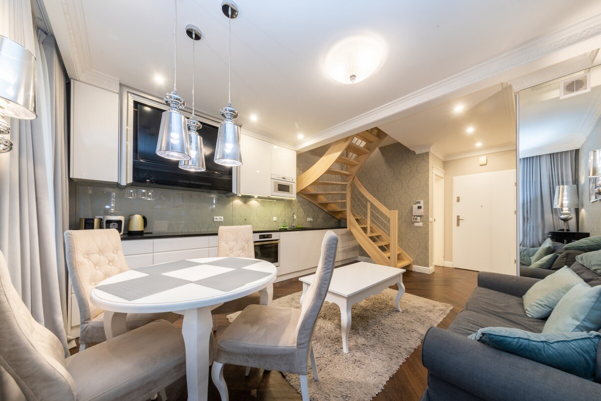 En nyrenoverad, lyxig lägenhet i centrum av Wrocław. Beläget på översta våningen i en lägenhetsbyggnad med hiss. Beläget bara några minuters promenad (400 meter) till Wrocławs torget. Ett bra ställe för familjer och människor som söker lugn och komfort i en unik inredning. Balkong med utsikt mot stadens silhuett. Gratis fiberinternet, 55" 4K SMART TV, luftkonditionering. Fri parkering i ett övervakat underjordiskt garage.