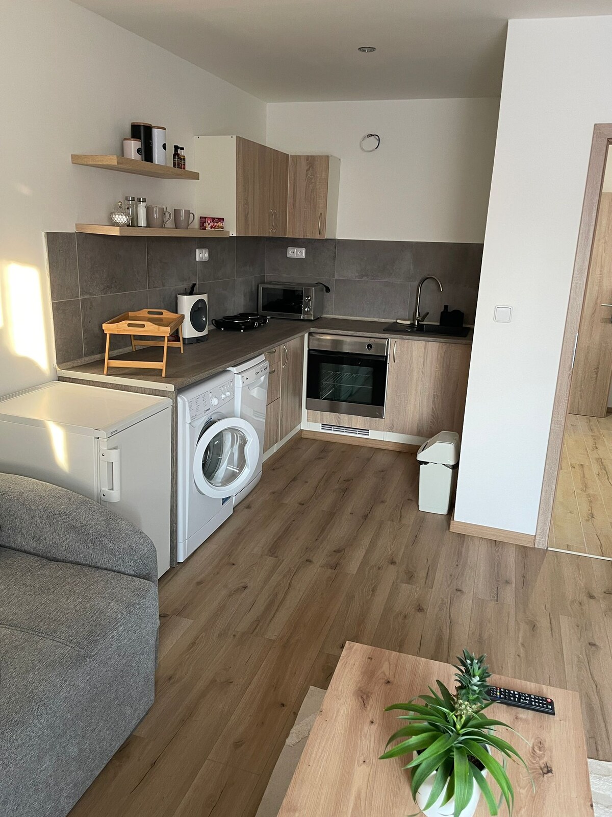 Jag vill erbjuda dig en privat lägenhet 2 + kk med balkong och parkering i en underjordisk garage i en nybyggd bostad på Tovární-gatan i Znojmo. Lägenheten har ett fullt utrustat kök med vitvaror och matplats, tillsammans med ett vardagsrum med en platt-TV och en bäddsoffa som är 140 cm bred när den är utfälld. Det finns också ett sovrum med en dubbelsäng och två garderober. Badrum med badkar separat från toaletten Lägenheten ligger 450 meter från stadens centrum, 200 meter från järnvägsstationen.