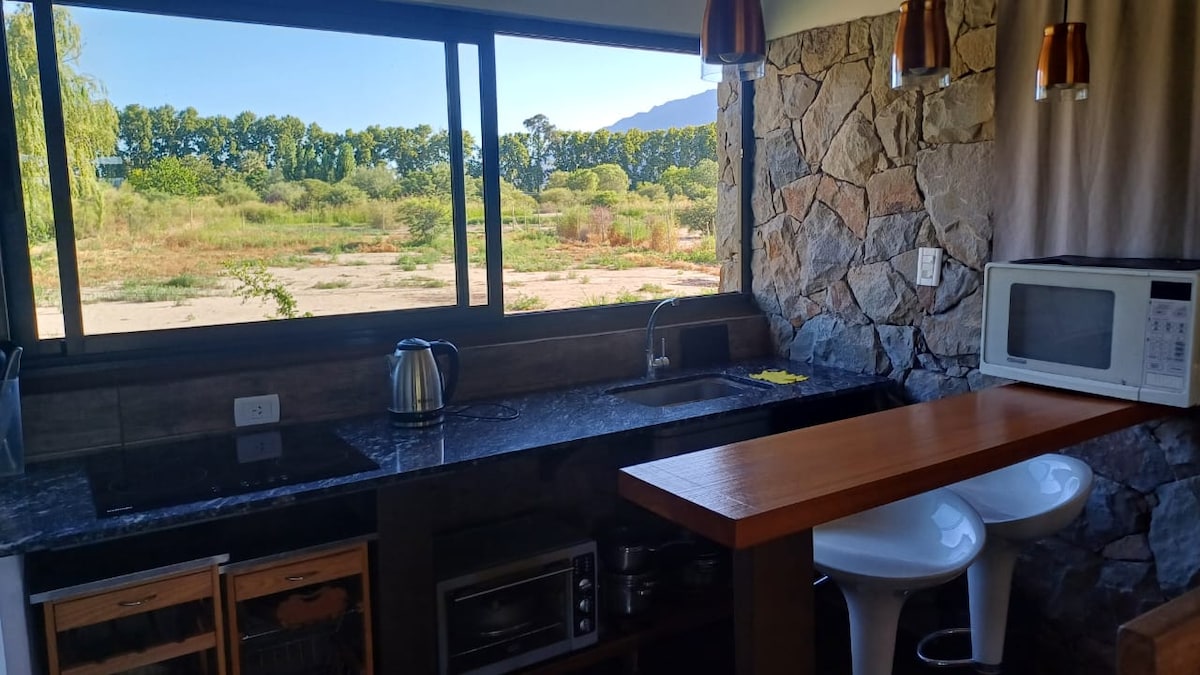Containerhus för 2 personer. Med integrerat kök med allt du behöver för att laga mat. Vi har stora grönområden, chulengo typ grill och täckt parkering. Cirkulerande är våra husdjur: 2 katter, 2 hundar och 2 kycklingar, vänliga och respektfulla. Kaffe, te och mate ingår för att förbereda. Du kan också begära frukostservice (valfritt). Exceptionell utsikt över bergen och lugn eftersom huset ligger i ett halvlandsbygdsområde, omgivet av berg och vingårdar.