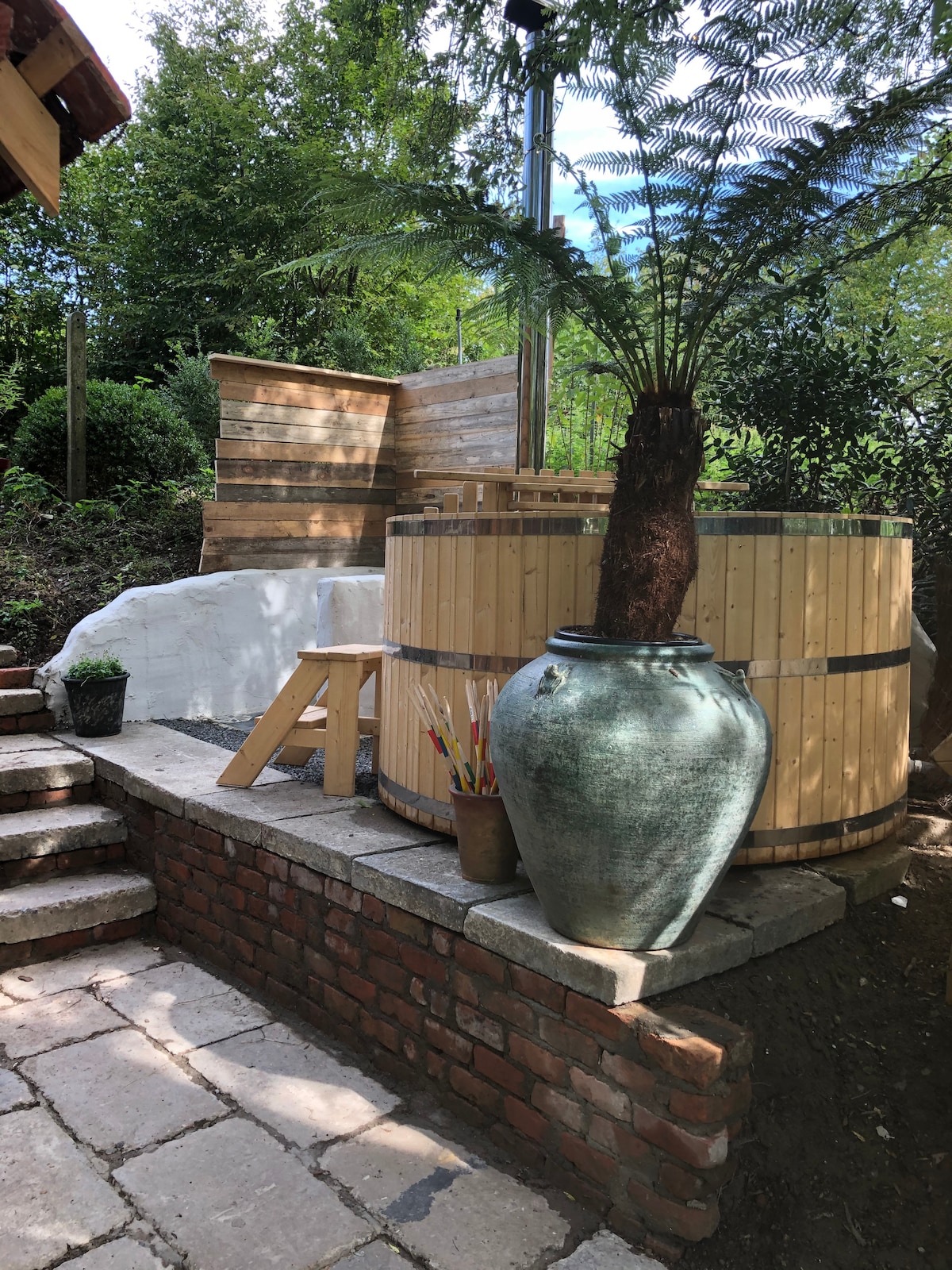 Pompkot met hottub aan de vijver.