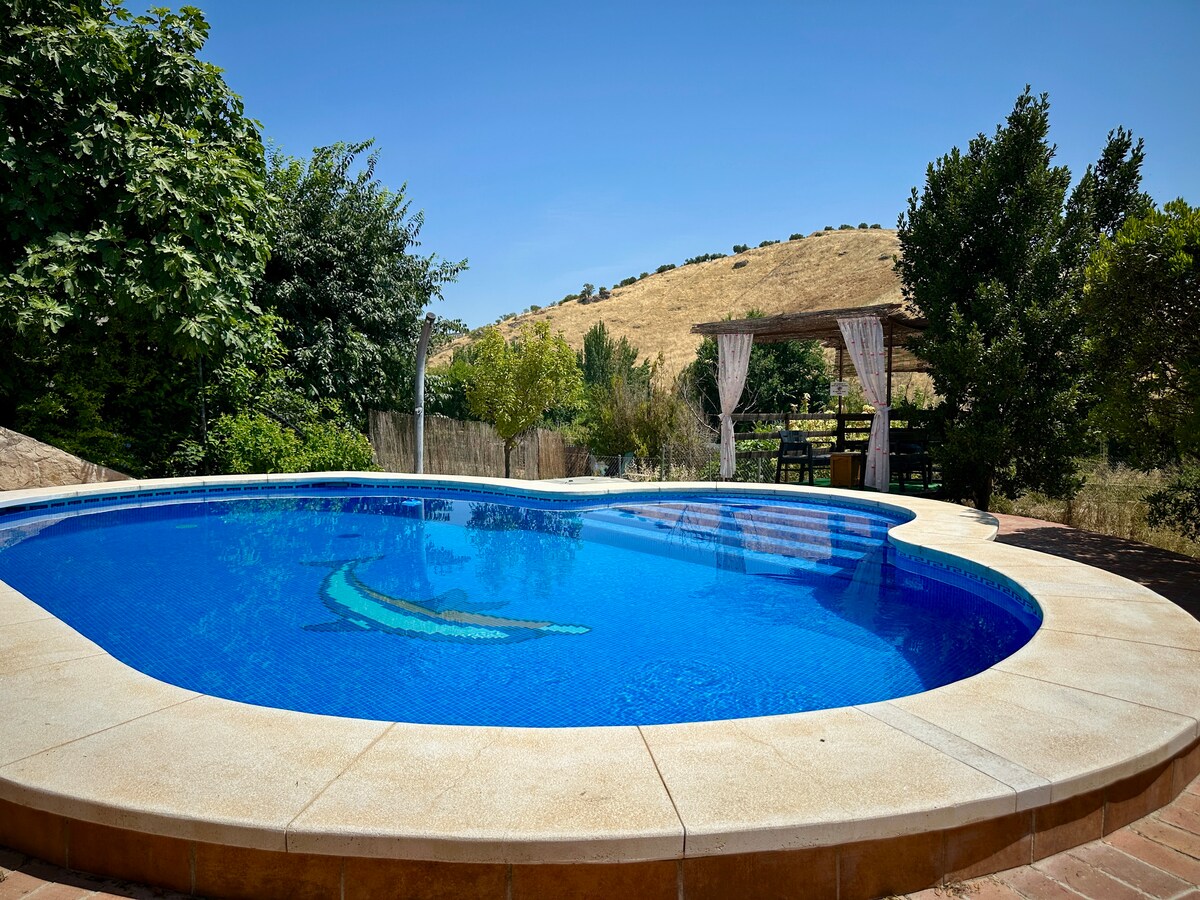 Det är ett lantligt hus med en mycket speciell charm, i centrala Andalusien, en timme från de viktigaste huvudstäderna i regionen, byggt på en saltvattenspool av strandtyp. Framför ett stort vattenfall av natursten. Det har ett magnifikt spaområde med en utomhusjacuzzi med varmt vatten där du kan njuta av avkoppling under stjärnklara nätter. Inramad av palmer och hörn för att koppla av bland melodierna av vattenfall och fåglar.